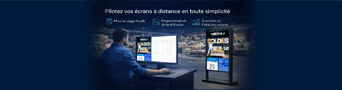 MEDIA4 développe et installe des dispositifs d’affichage dynamique clé en main, intégrant écrans LED, totems, plateforme de contrôle à distance et applications personnalisées. Une solution globale pour attirer, informer et engager vos clients en magasin.