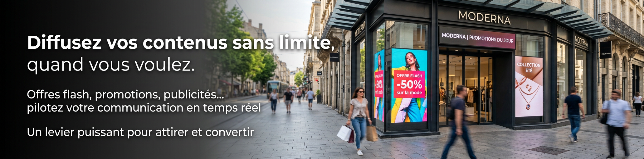Luminosité : de 4500 à 7000 cd/m² pour lisibilité extérieure Résolution : Compatible Full HD ou 4K Système anti-chauffage Programmable (horaires et dates)