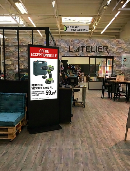 Les totems digitaux offrent un réel gain de temps pour les équipes, car les clients trouvent l’information par eux-mêmes. Ils favorisent l’engagement grâce à une interaction tactile et une navigation intuitive des produits. Idéals pour les promotions, plans de magasin, fiches produits ou services click & collect, ils valorisent votre image avec une solution technologique moderne et intuitive.
